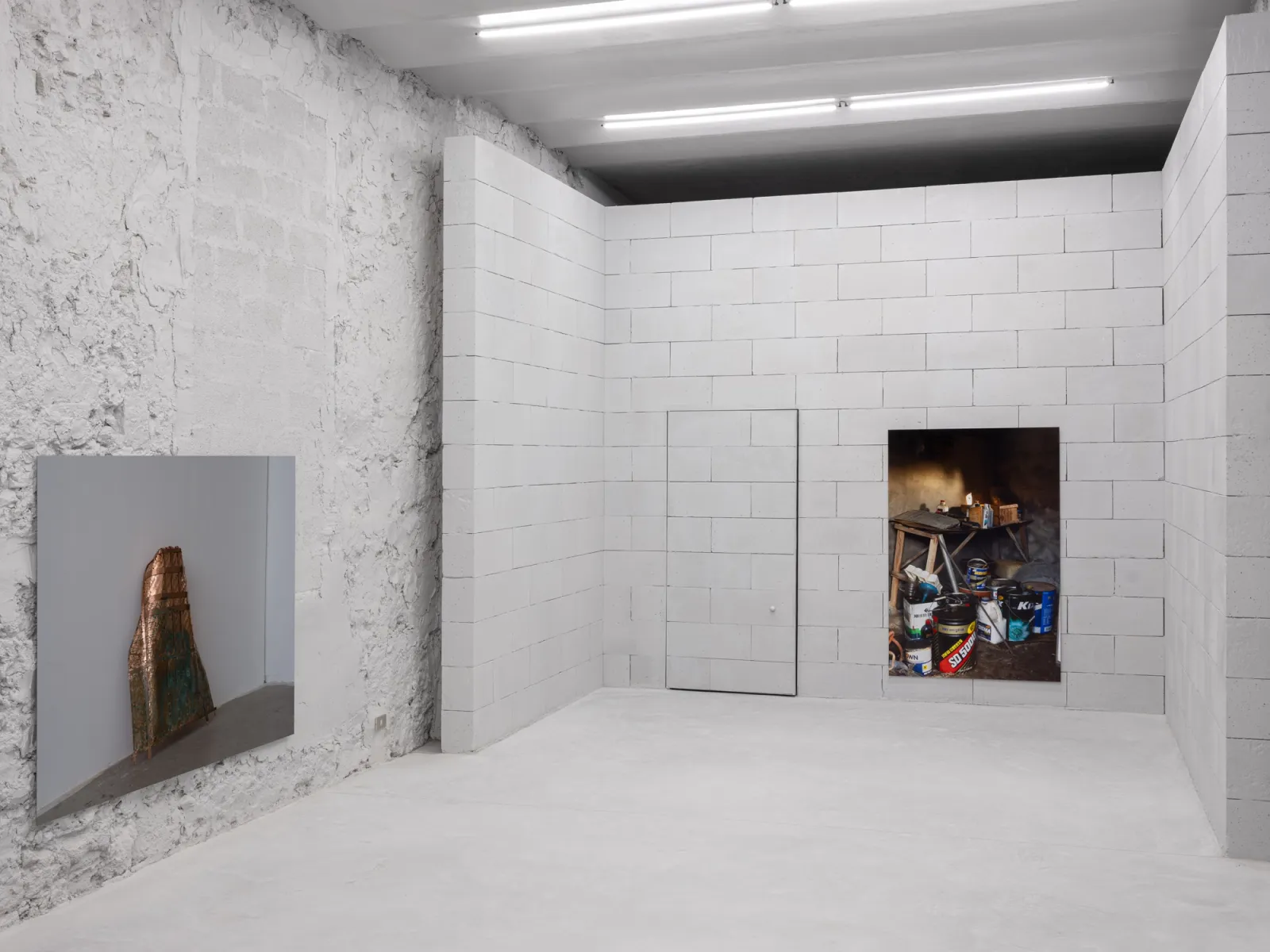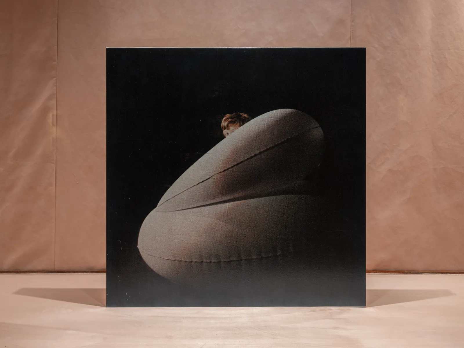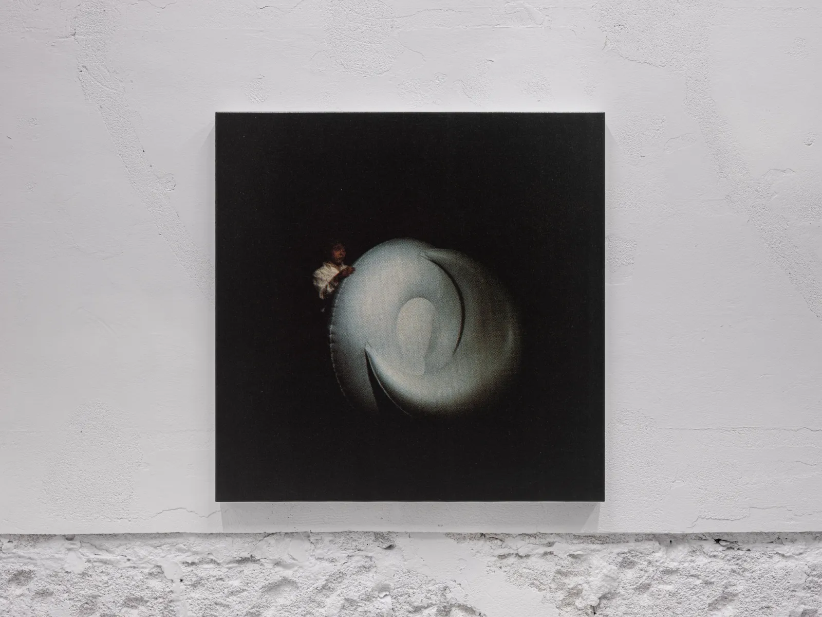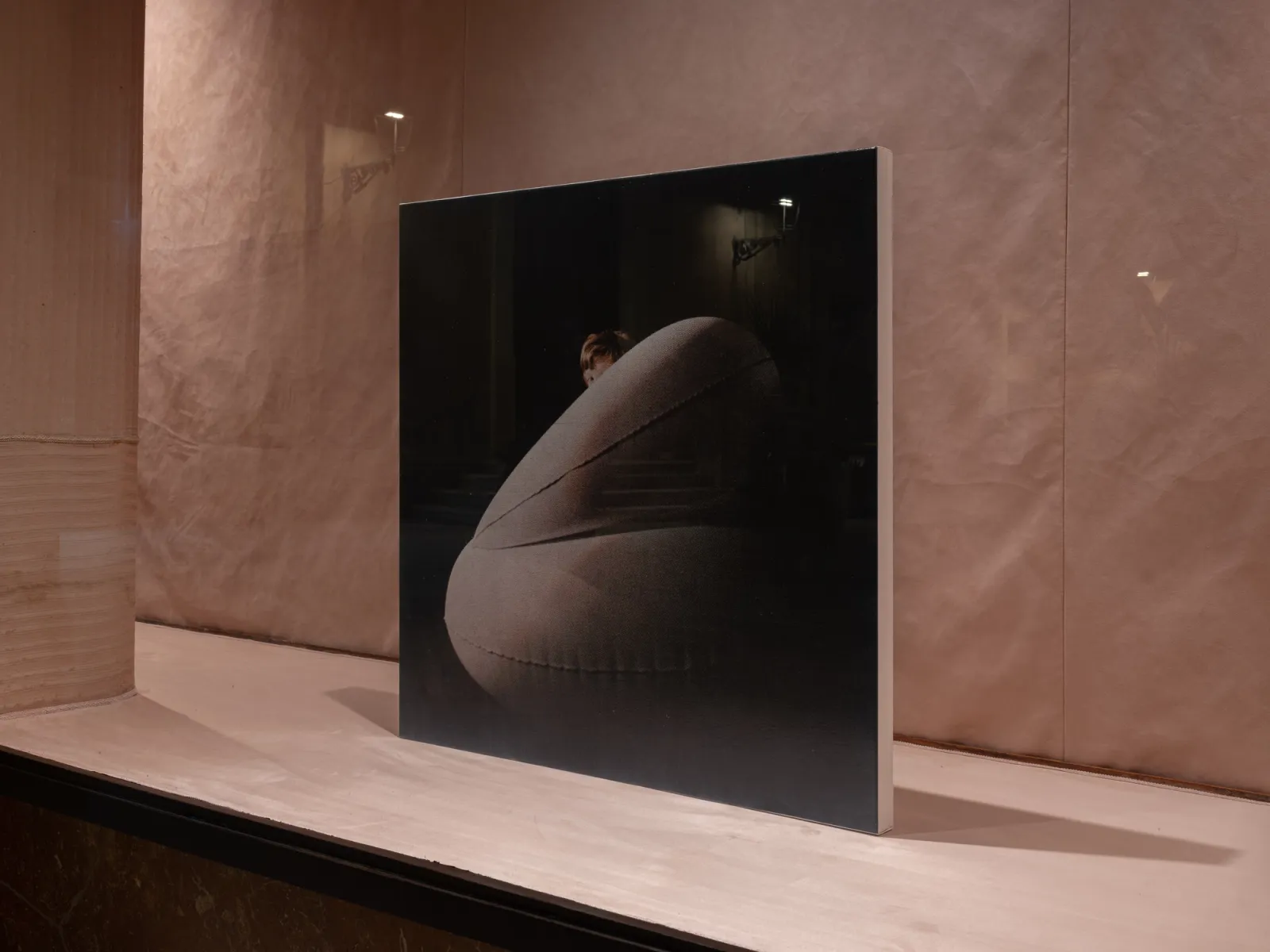 Installed throughout the show, Cho’s recent series, After Giorgio Casali I-II-III (all 2025), reproduces photographer Giorgio Casali’s images of an inflatable chair designed by Bernard Quentin that were originally published in an issue of Domus magazine from the 1960s. The artist enlarged three images to a scale that makes their registration visible, which he then printed on linen and coated in lacquer – a sealant that is used to protect surfaces. Applied here, it solidifies an image that had already appeared in print media, reintegrating it back into the physical world. Across his practice, photography meets other forms, such as painting, sculpture, architecture and design; the artist making fresh use of it in an inattentive present where images feed the camera’s eye.