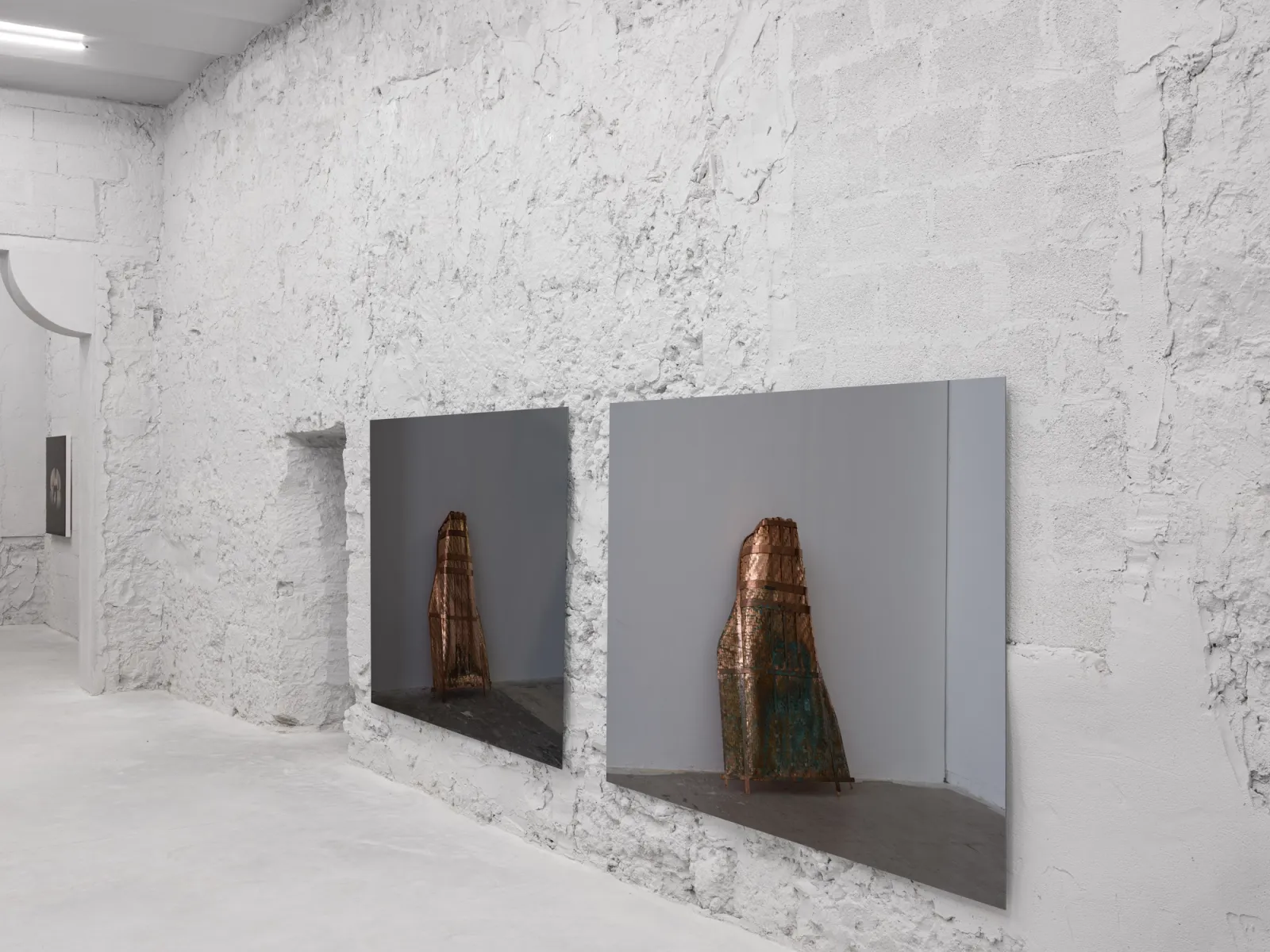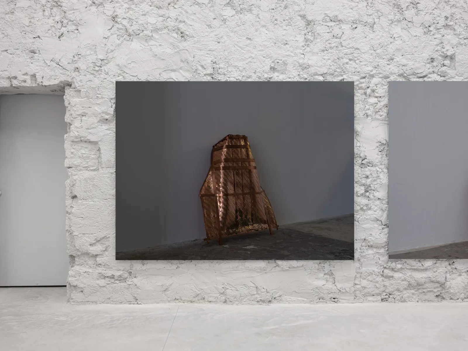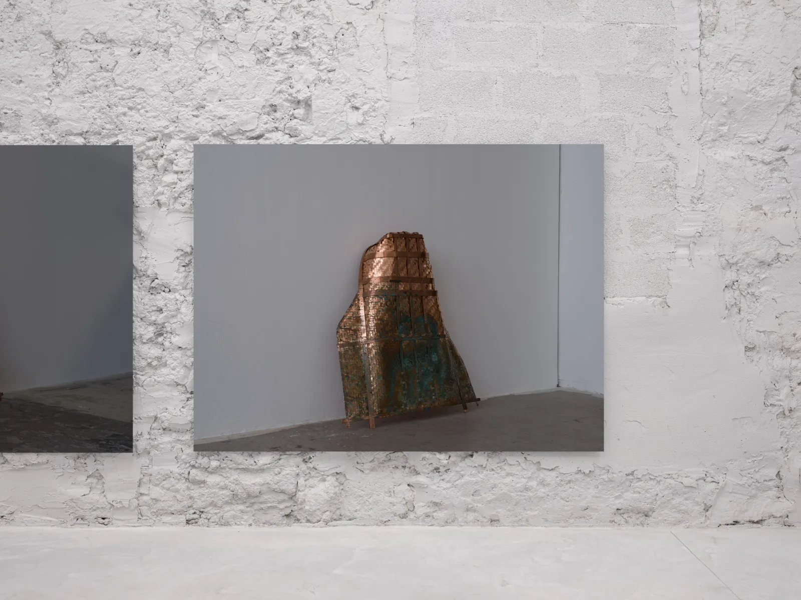Shown alongside La Borde, Cho’s photographic work reconsiders the reliability of images today and how their status changes as they circulate publicly across various platforms. Several photographs in the show revolve around two of the artist’s recent sculptures, reproductions of a Korean winnowing basket, and trace the origin, making, and eventual documentation of these works. The sculptures are based on a Ki, a rice harvesting tool traditionally made of bamboo that the artist reconstructed in copper. The Ki was also an object of shame: as a punishment for children who wet the bed, they were made to wear it publicly. After making his sculptures, the artist urinated on them – urine oxidizes copper – in an act that could be interpreted as a rebuttal of childhood embarrassment. For Untitled Sculpture I-II (both 2025), Cho photographed the sculptures as they were installed in a recent show in Frankfurt, using a 400-megapixel medium-format camera to capture the works at a one-to-one scale. By exhibiting images of the works rather than the sculptures themselves, the artist invokes the inevitable loss, of both detail and engagement, in reproductions of artworks usually seen again circulating online or printed in publications. Moreover, Cho introduces the role of subjectivity into the documentation of artworks. While it is often professional photographers who document art, there is a lineage of artists who have photographed their own work; early examples being Constantin Brancusi and Medardo Rosso, the latter of whom was the only photographer of his sculptures.