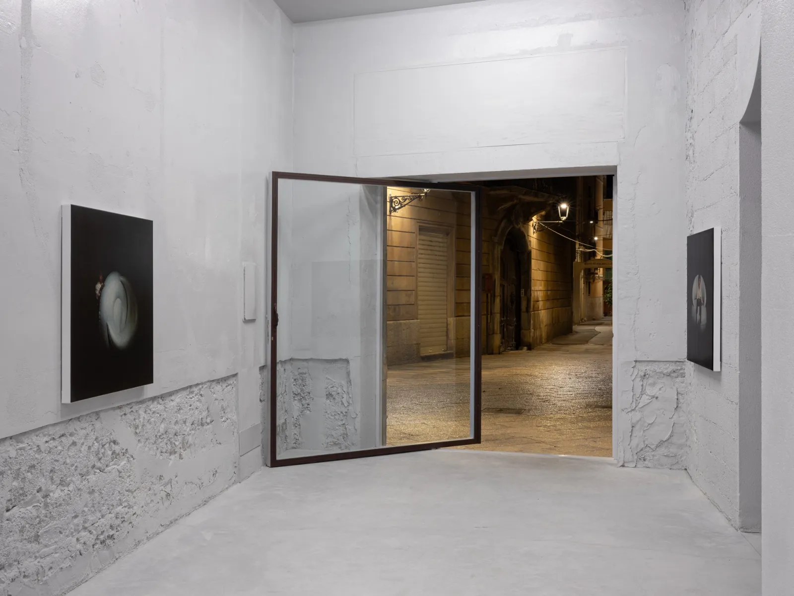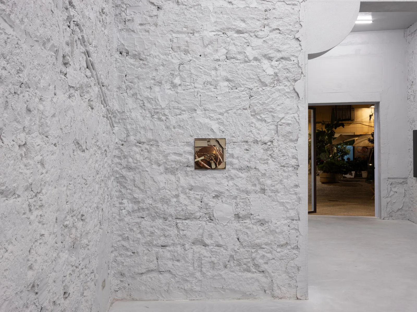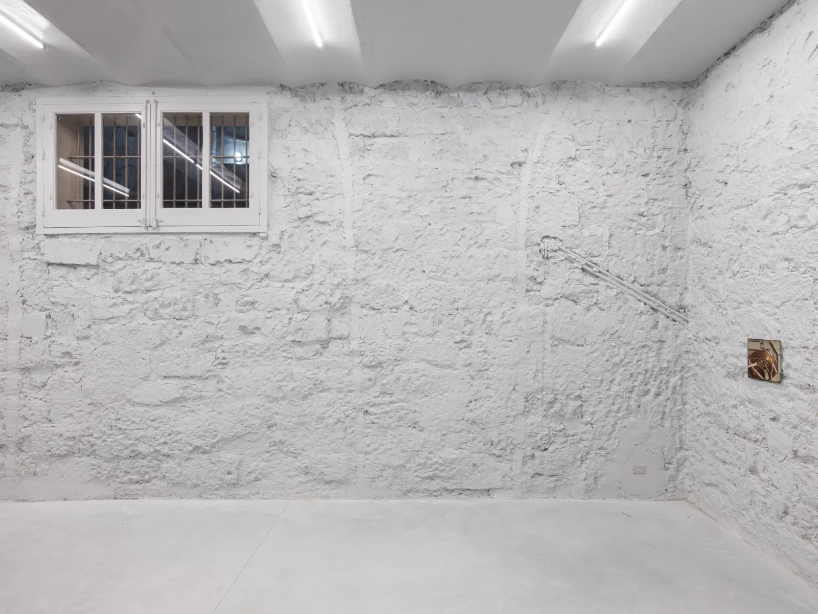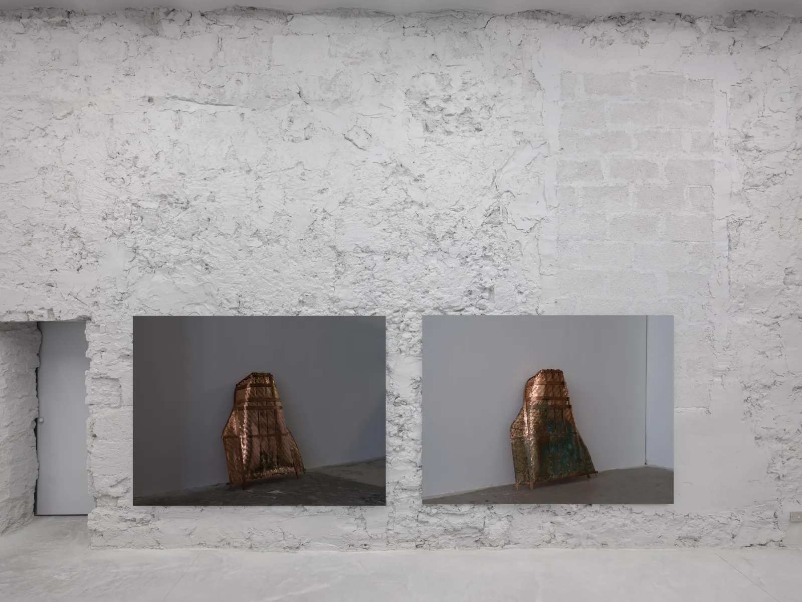 Shown alongside La Borde, Cho’s photographic work reconsiders the reliability of images today and how their status changes as they circulate publicly across various platforms. Several photographs in the show revolve around two of the artist’s recent sculptures, reproductions of a Korean winnowing basket, and trace the origin, making, and eventual documentation of these works. The sculptures are based on a Ki, a rice harvesting tool traditionally made of bamboo that the artist reconstructed in copper. The Ki was also an object of shame: as a punishment for children who wet the bed, they were made to wear it publicly. After making his sculptures, the artist urinated on them – urine oxidizes copper – in an act that could be interpreted as a rebuttal of childhood embarrassment. For Untitled Sculpture I-II (both 2025), Cho photographed the sculptures as they were installed in a recent show in Frankfurt, using a 400-megapixel medium-format camera to capture the works at a one-to-one scale. By exhibiting images of the works rather than the sculptures themselves, the artist invokes the inevitable loss, of both detail and engagement, in reproductions of artworks usually seen again circulating online or printed in publications. Moreover, Cho introduces the role of subjectivity into the documentation of artworks. While it is often professional photographers who document art, there is a lineage of artists who have photographed their own work; early examples being Constantin Brancusi and Medardo Rosso, the latter of whom was the only photographer of his sculptures.