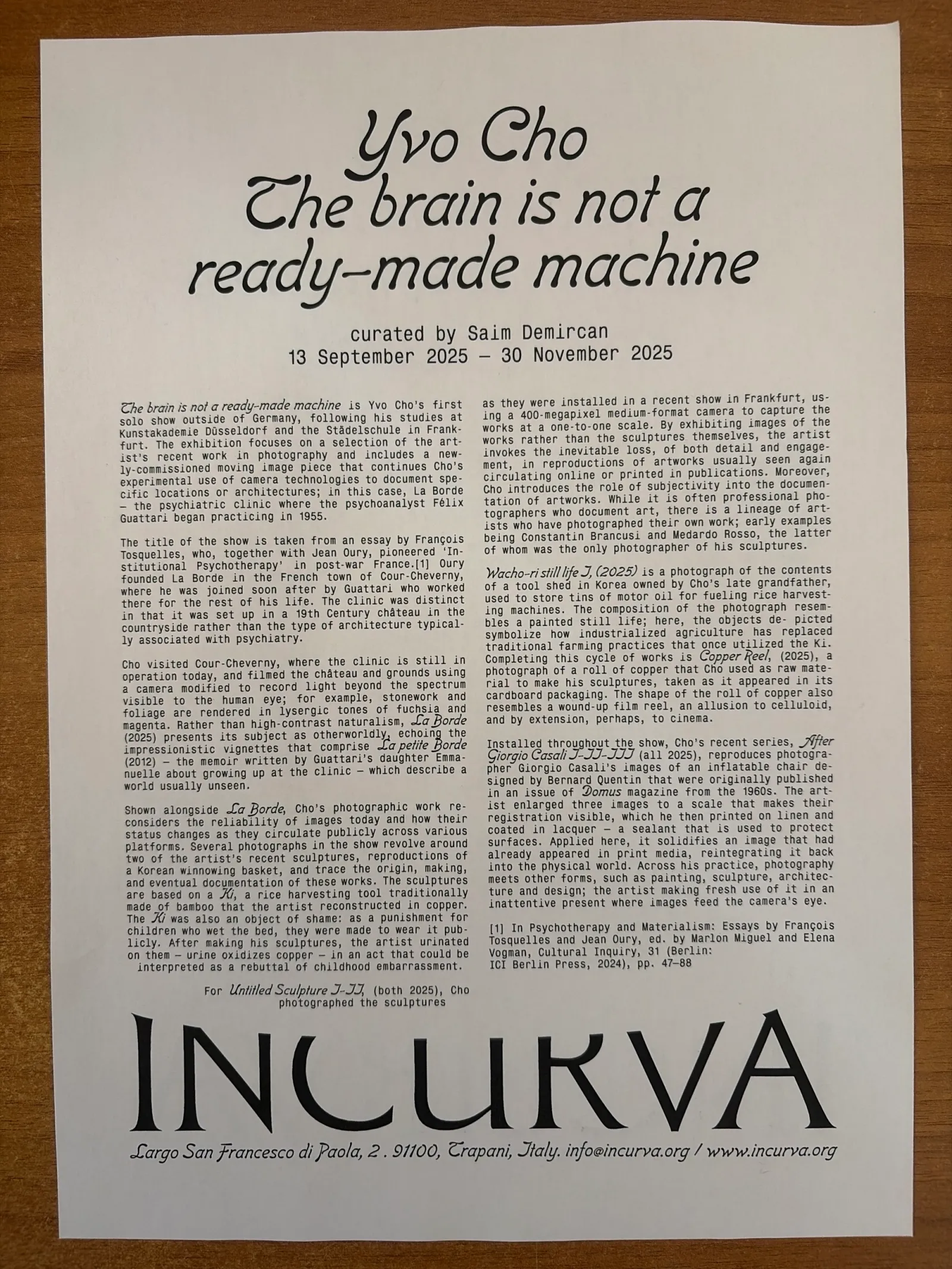 The brain is not a ready-made machine is Yvo Cho’s first solo show outside of Germany, following his studies at Kunstakademie Düsseldorf and the Städelschule in Frankfurt. The exhibition focuses on a selection of the artist’s recent work in photography and includes a newly-commissioned moving image piece that continues Cho’s experimental use of camera technologies to document specific locations or architectures; in this case, La Borde – the psychiatric clinic where the psychoanalyst Félix Guattari began practicing in 1955.