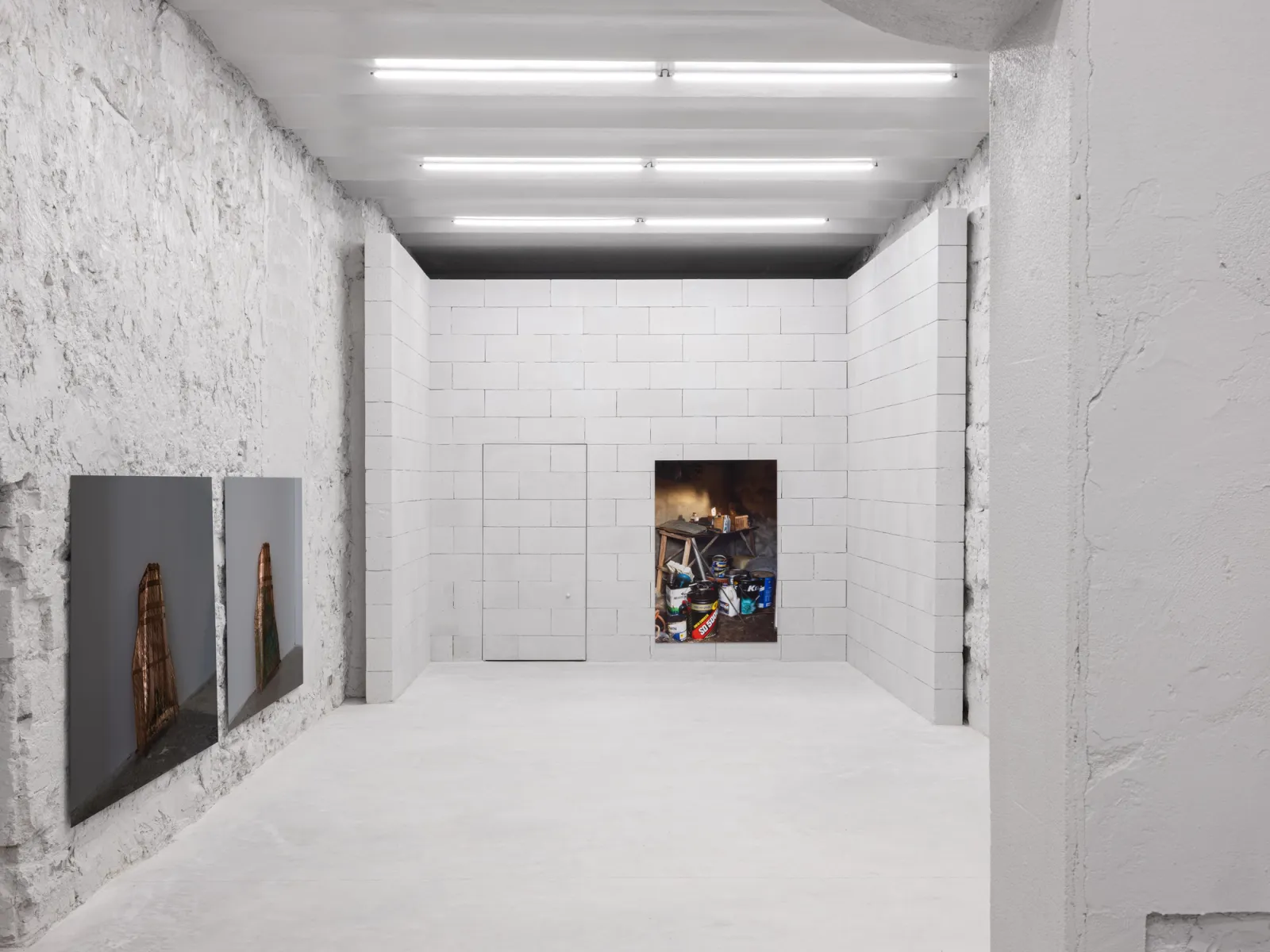 Wacho-Ri still life I, (2025) is a photograph of the contents of a tool shed in Korea owned by Cho’s late grandfather, used to store tins of motor oil for fueling rice harvesting machines. The composition of the photograph resembles a painted still life; here, the objects depicted symbolize how industrialized agriculture has replaced traditional farming practices that once utilized the Ki. Completing this cycle of works is Copper Reel, (2025), a photograph of a roll of copper that Cho used as raw material to make his sculptures, taken as it appeared in its cardboard packaging. The shape of the roll of copper also resembles a wound-up film reel, an allusion to celluloid, and by extension, perhaps, to cinema.