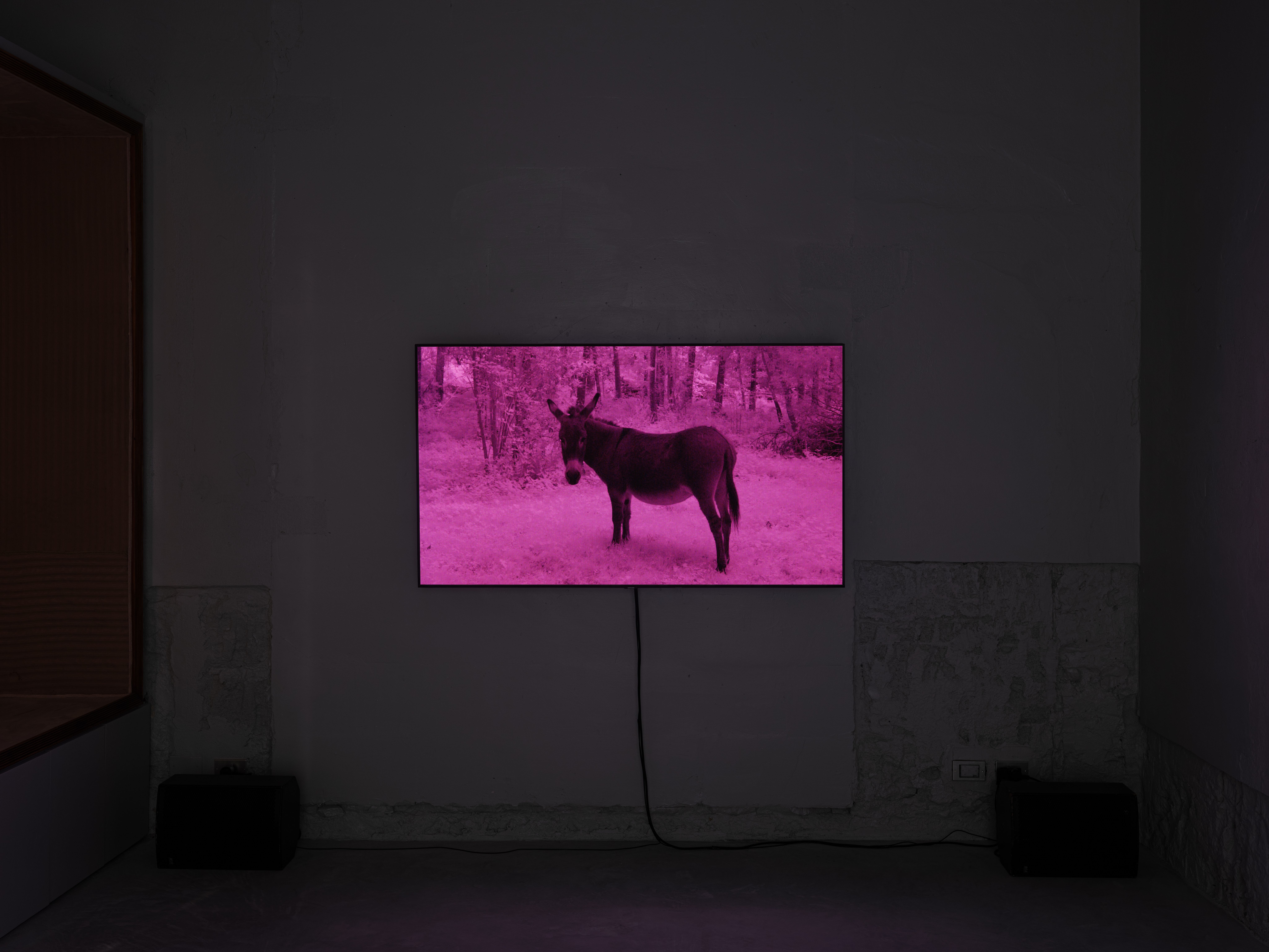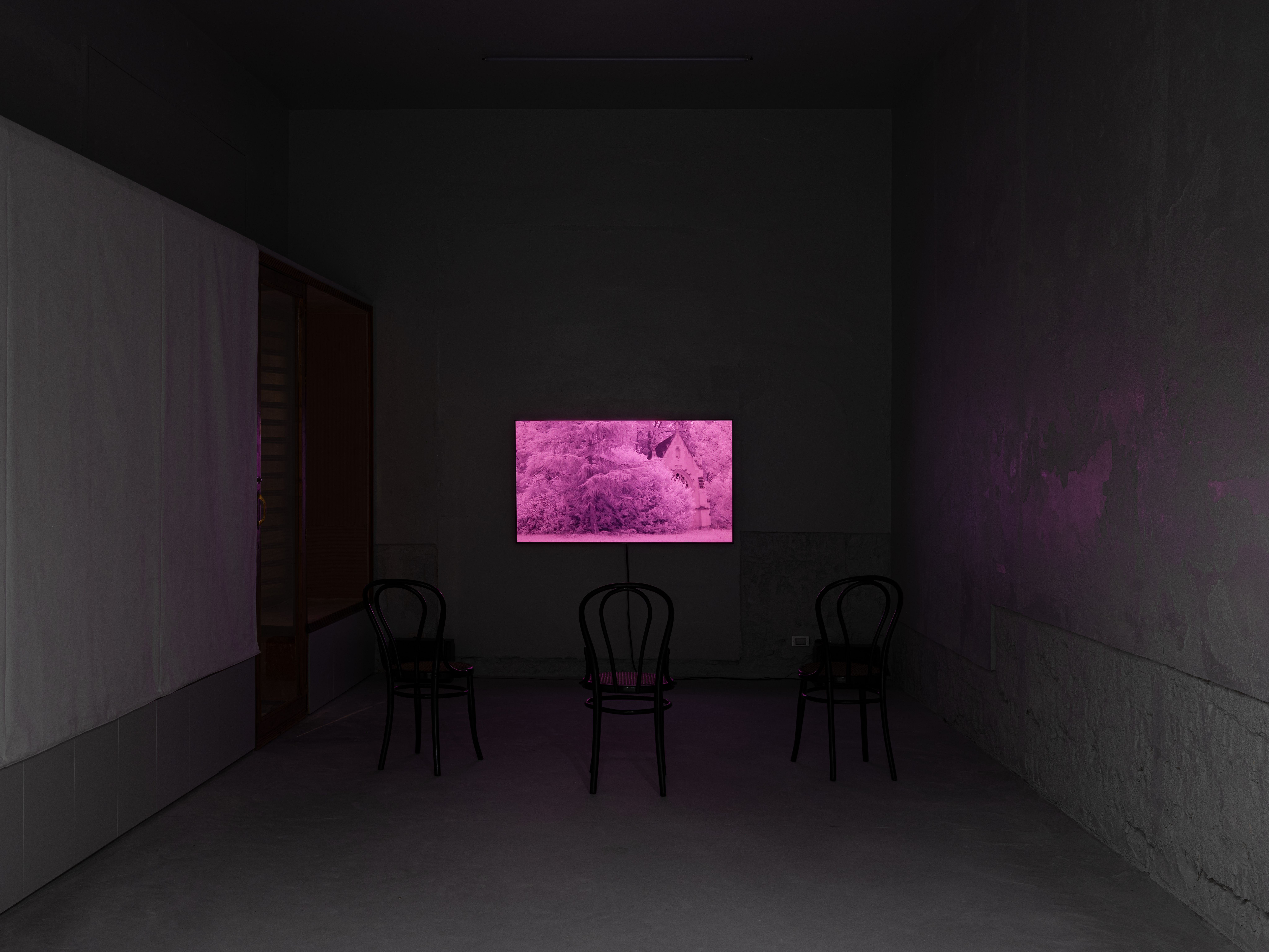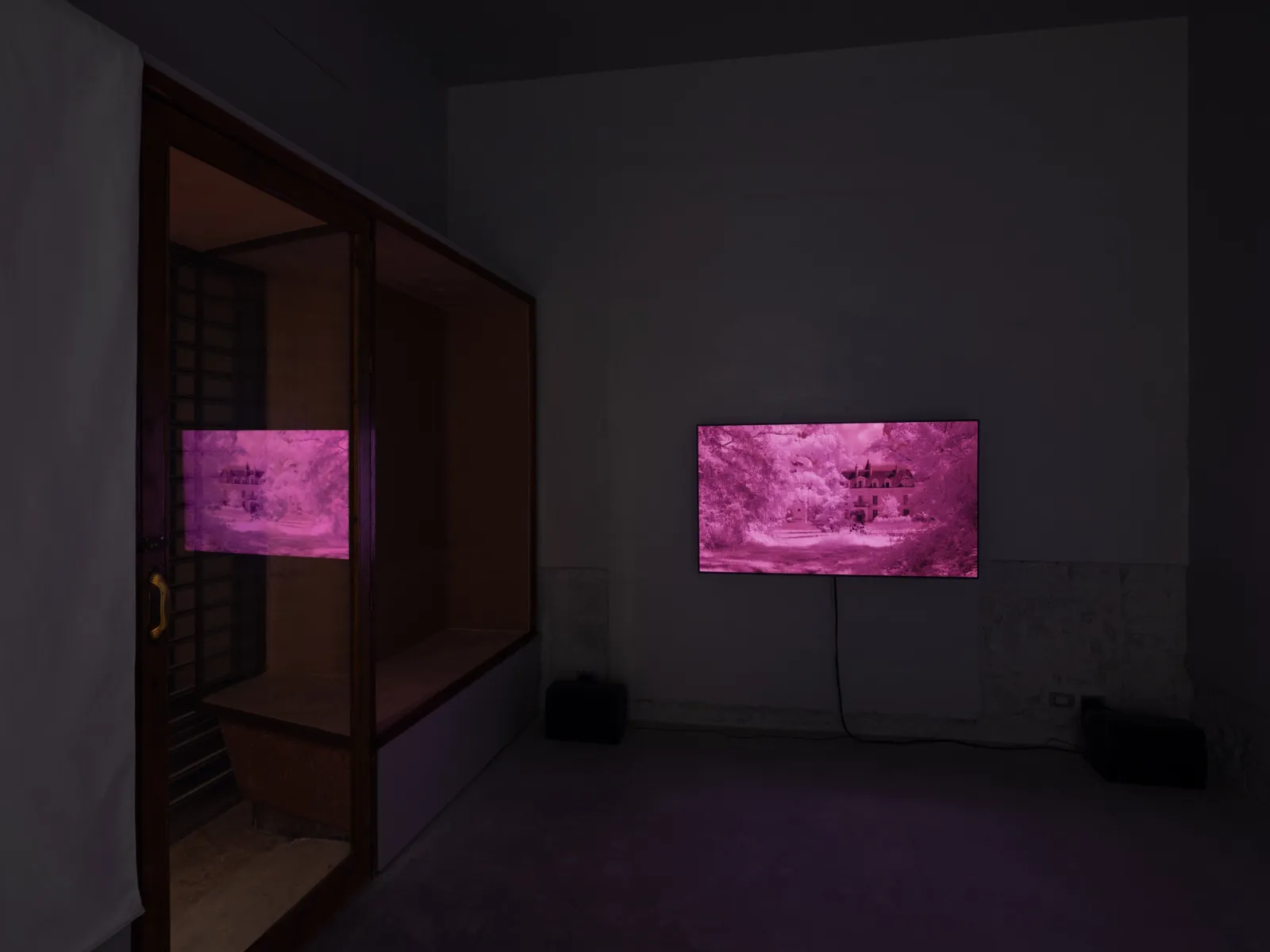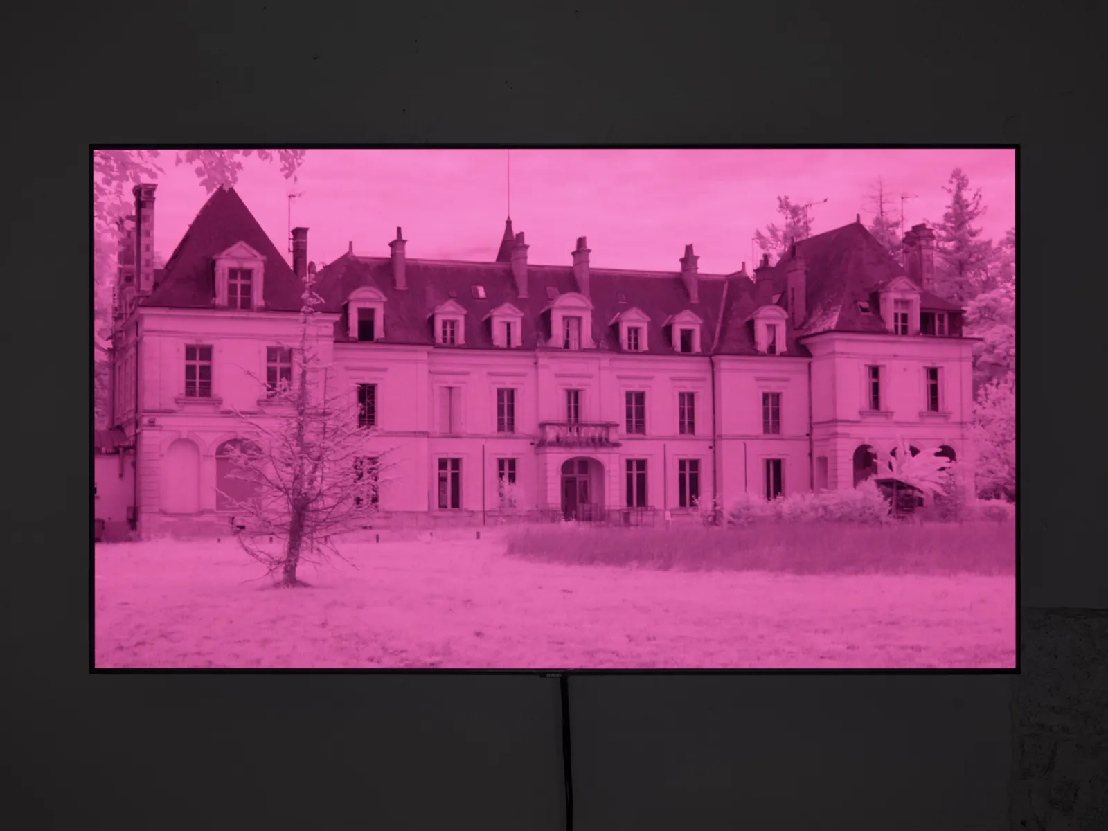 La Borde (2025) is a moving image work by Yvo Cho presented for the first time on the occasion of his solo exhibition “The brain is not a ready-made machine” held at INCURVA in 2025. The work, produced by INCURVA, continues Cho’s experimental use of camera technologies to document specific locations or architectures; in this case, La Borde the psychiatric clinic where the psychoanalyst Félix Guattari began practicing in 1955. The title of the show is taken from an essay by François Tosquelles, who, together with Jean Oury, pioneered ‘Institutional Psychotherapy’ in post-war France. [1] Oury founded La Borde in the French town of Cour-Cheverny, where he was joined soon after by Guattari who worked there for the rest of his life. The clinic was distinct in that it was set up in a 19th Century château in the countryside rather than the type of architecture typically associated with psychiatry. Cho visited Cour-Cheverny, where the clinic is still in operation today, and filmed the château and grounds using a camera modified to record light beyond the spectrum visible to the human eye; for example, stonework and foliage are rendered in lysergic tones of fuchsia and magenta. Rather than high-contrast naturalism, La Borde (2025) presents its subject as otherworldly, echoing the impressionistic vignettes that comprise La petite Borde (2012) – the memoir written by Guattari’s daughter Emmanuelle about growing up at the clinic – which describe a world usually unseen.