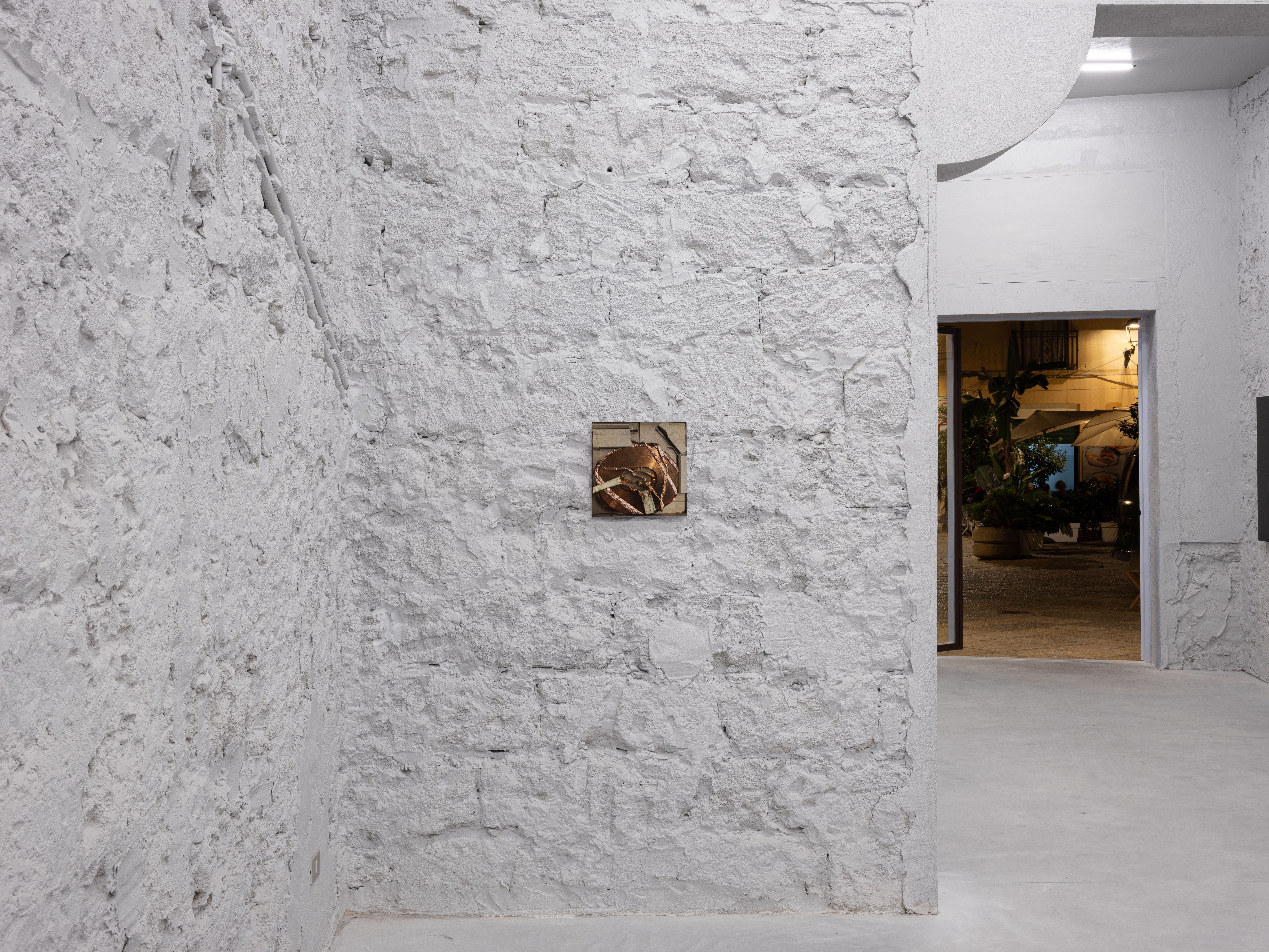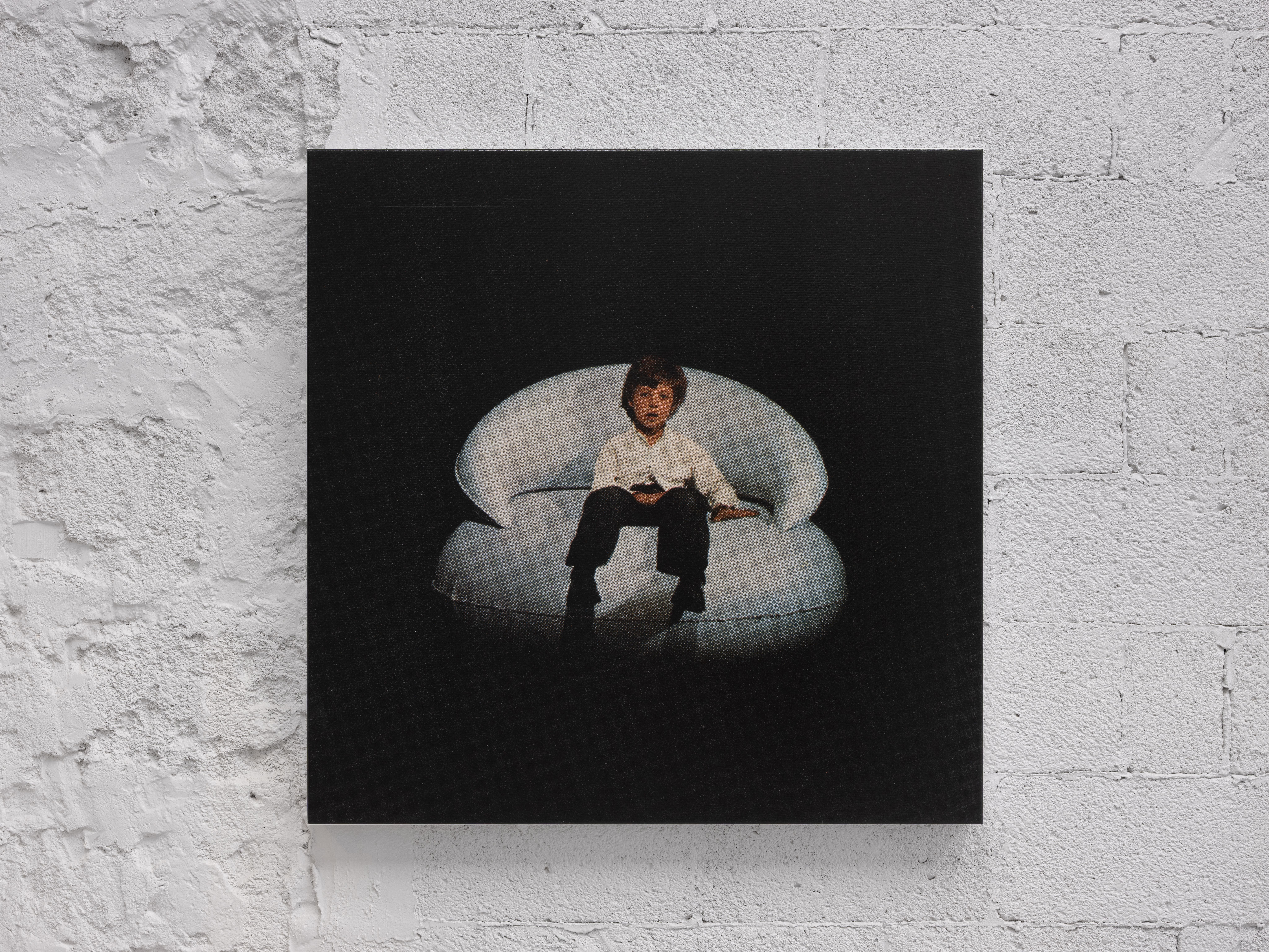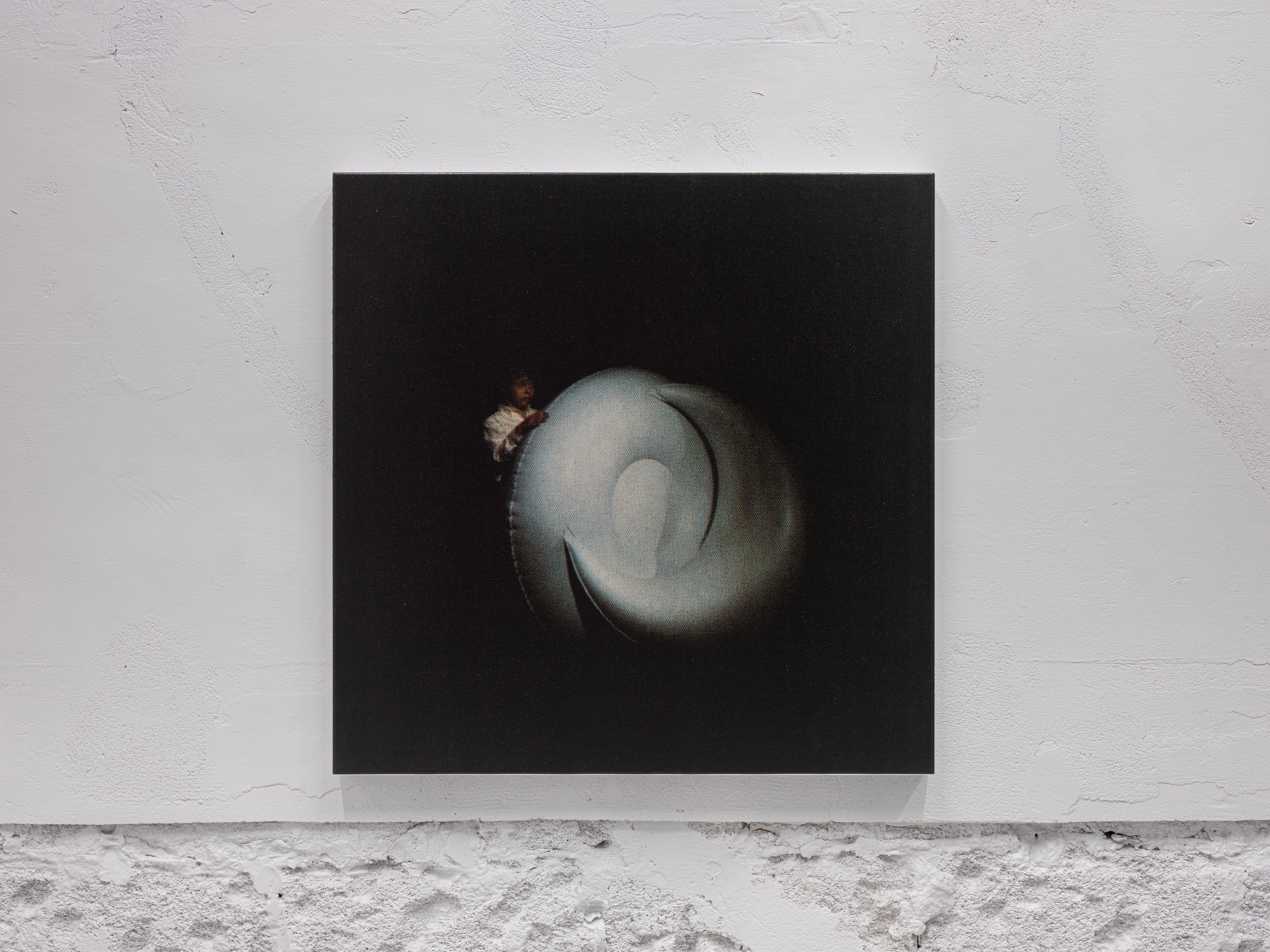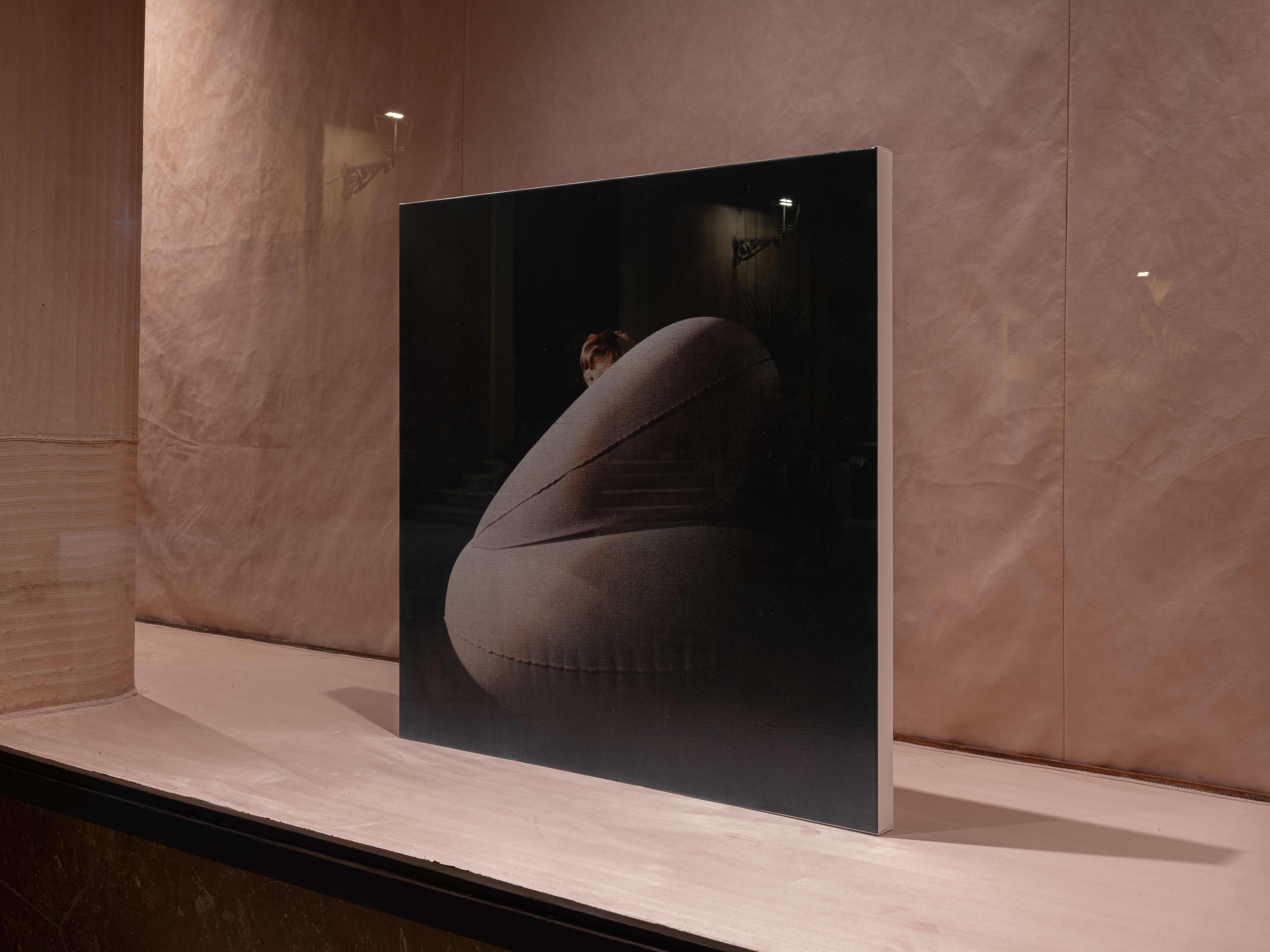 Distribuita in tutta la mostra, la serie recente di Cho, After Giorgio Casali I-II-III (tutte 2025), riproduce immagini del fotografo Giorgio Casali raffiguranti una poltrona gonfiabile disegnata da Bernard Quentin, originariamente pubblicate in un numero della rivista Domus negli anni Sessanta. L’artista ha ingrandito tre immagini fino a renderne visibile la grana, poi le ha stampate su lino e trattata con lacca – un sigillante utilizzato per proteggere le superfici. Applicata qui, solidifica un’immagine che era già apparsa nei media di carta stampata, reintegrandola nel mondo fisico. Nella sua pratica, la fotografia incontra altre forme – pittura, scultura, architettura e design – di cui l’artista rinnova l’uso in un presente distratto, dove le immagini alimentano lo sguardo della macchina fotografica.