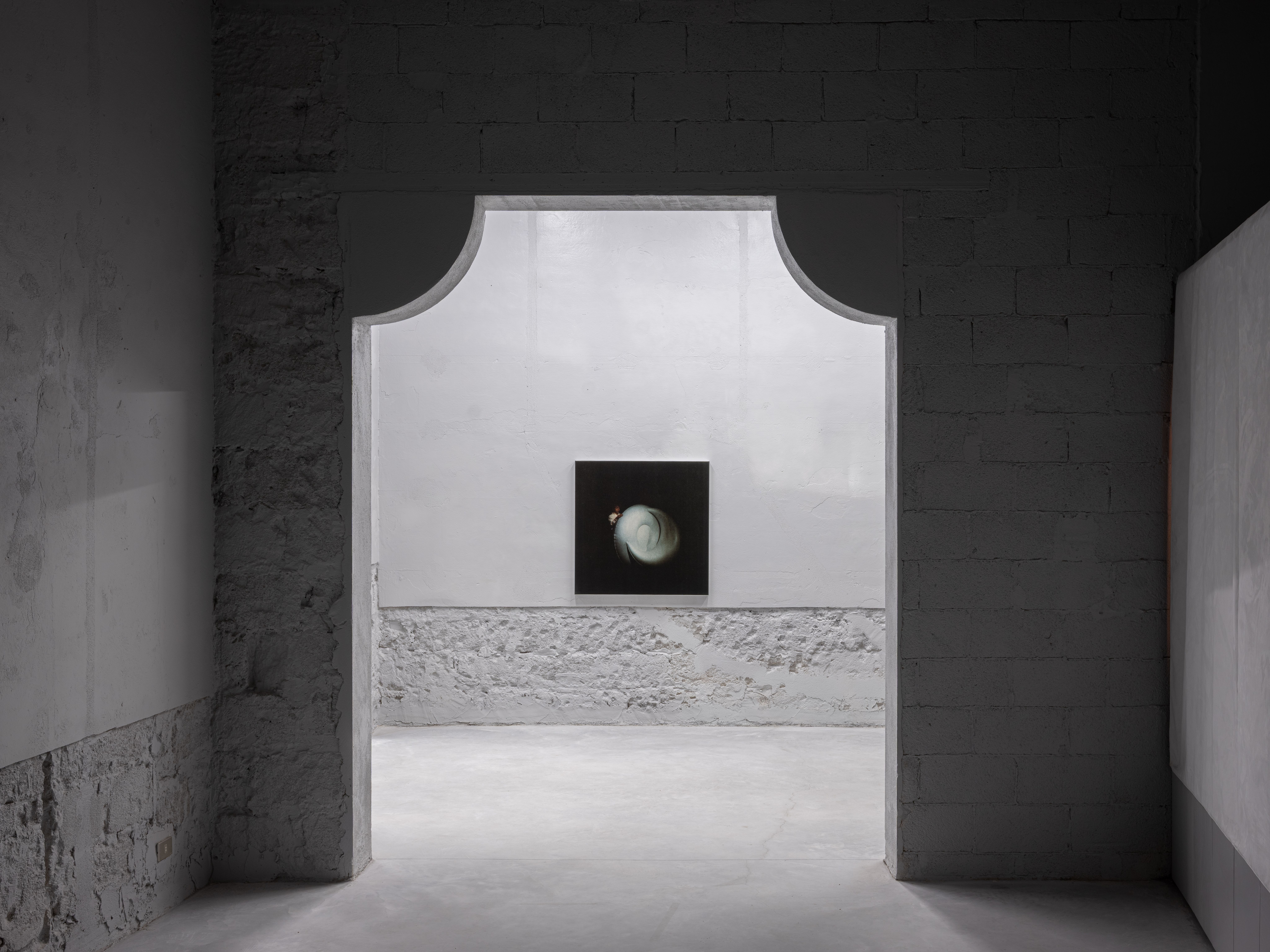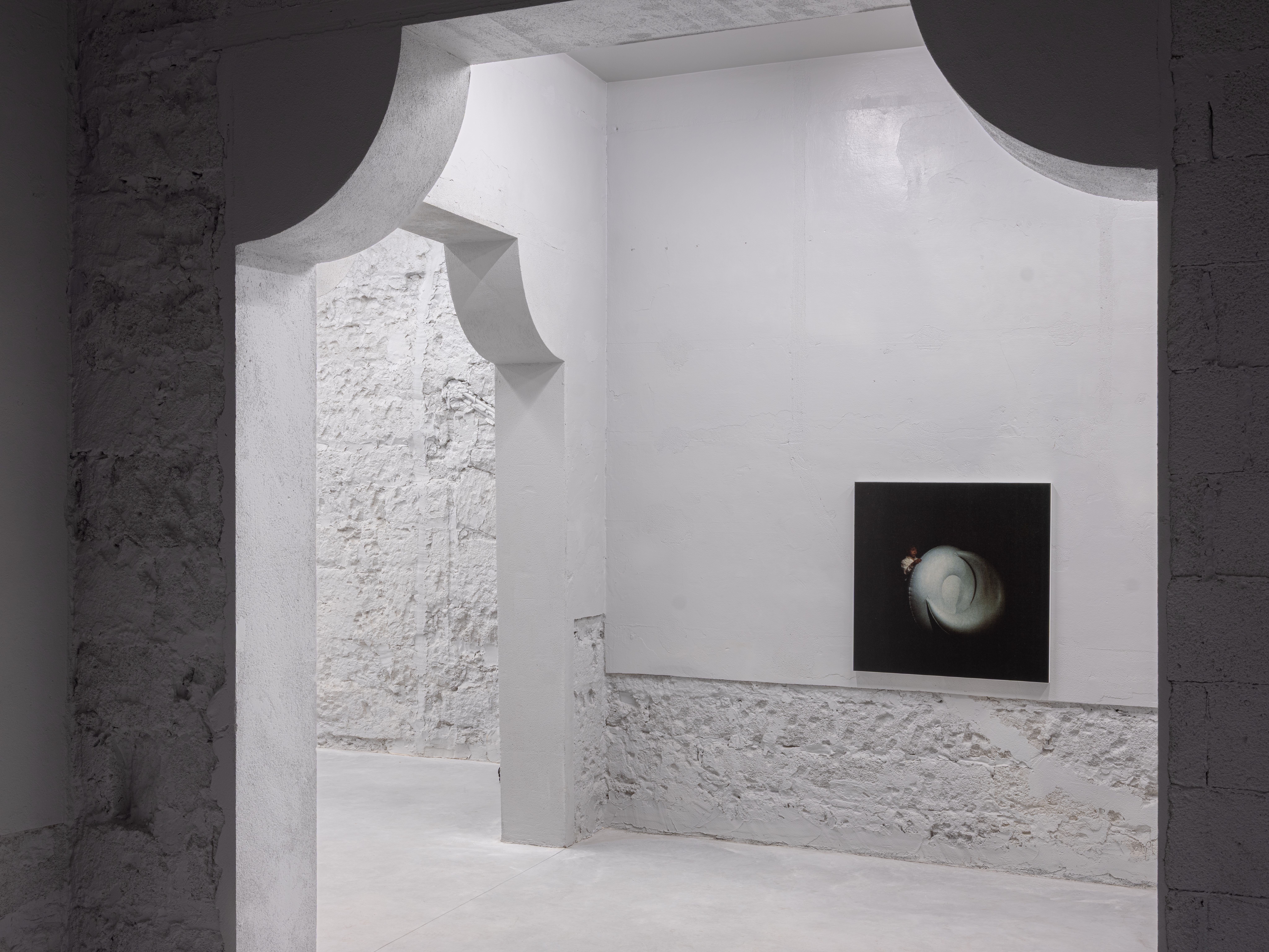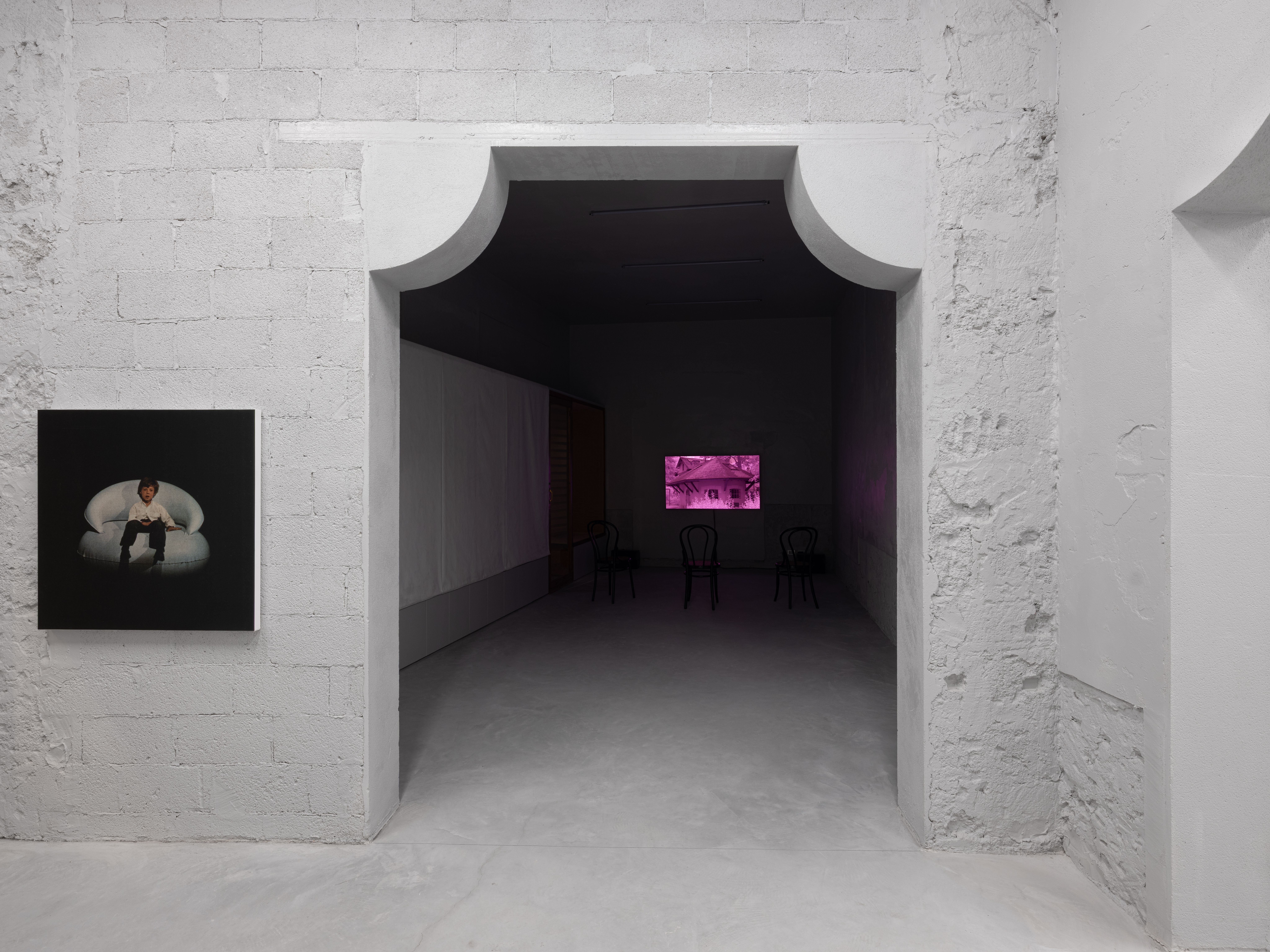 Distribuita in tutta la mostra, la serie recente di Cho, After Giorgio Casali I-II-III (tutte 2025), riproduce immagini del fotografo Giorgio Casali raffiguranti una poltrona gonfiabile disegnata da Bernard Quentin, originariamente pubblicate in un numero della rivista Domus negli anni Sessanta. L’artista ha ingrandito tre immagini fino a renderne visibile la grana, poi le ha stampate su lino e trattata con lacca – un sigillante utilizzato per proteggere le superfici. Applicata qui, solidifica un’immagine che era già apparsa nei media di carta stampata, reintegrandola nel mondo fisico. Nella sua pratica, la fotografia incontra altre forme – pittura, scultura, architettura e design – di cui l’artista rinnova l’uso in un presente distratto, dove le immagini alimentano lo sguardo della macchina fotografica.