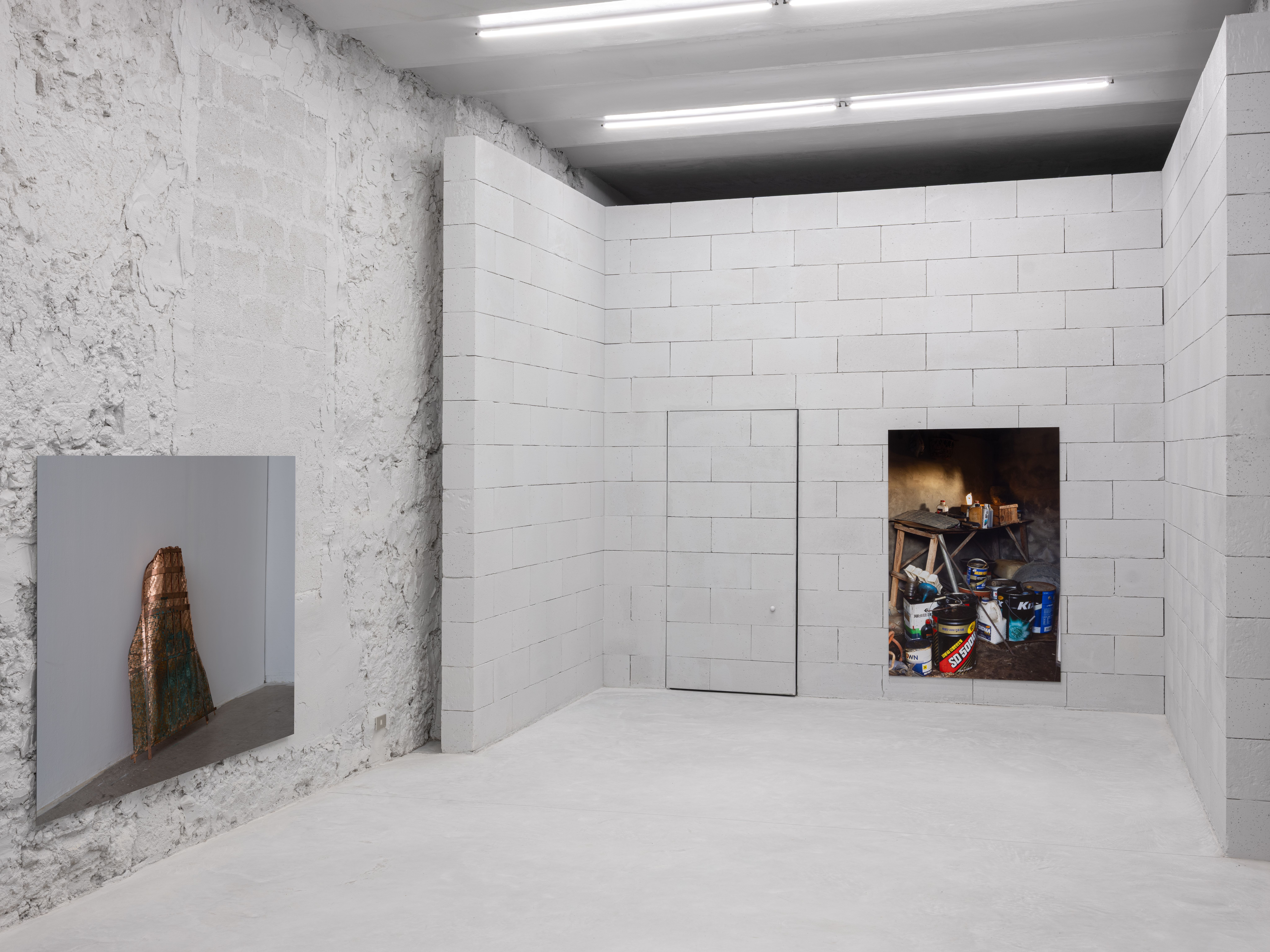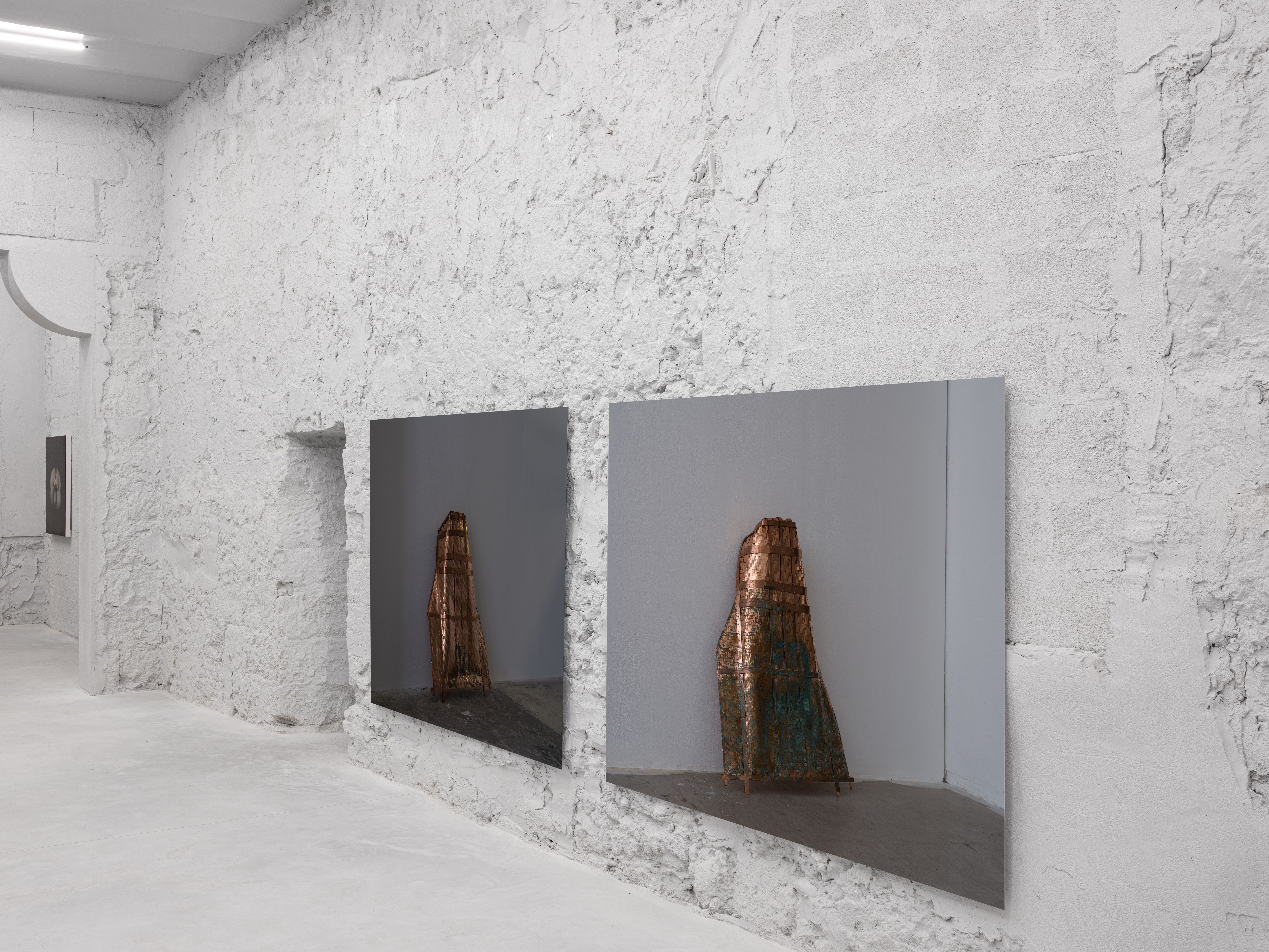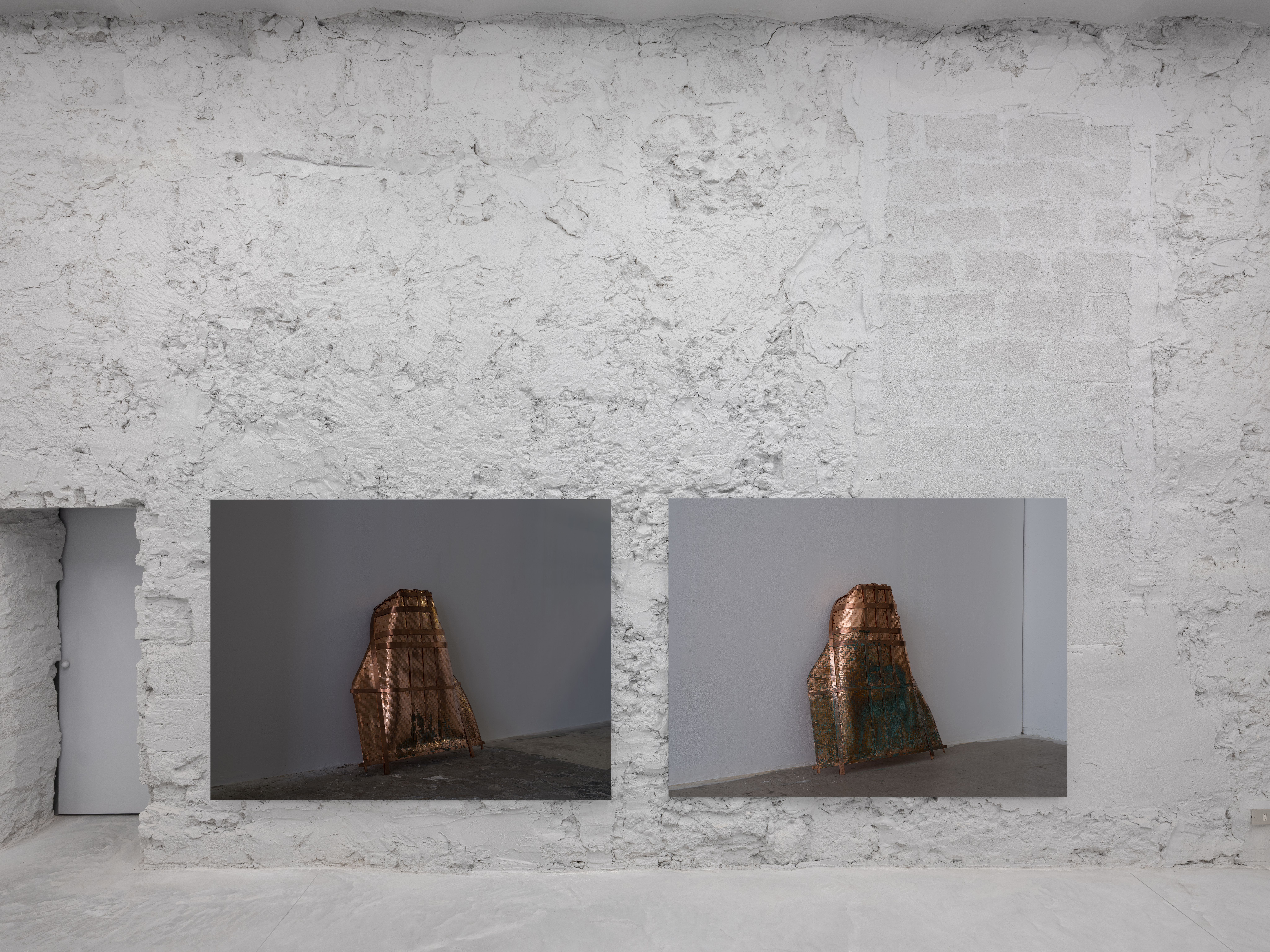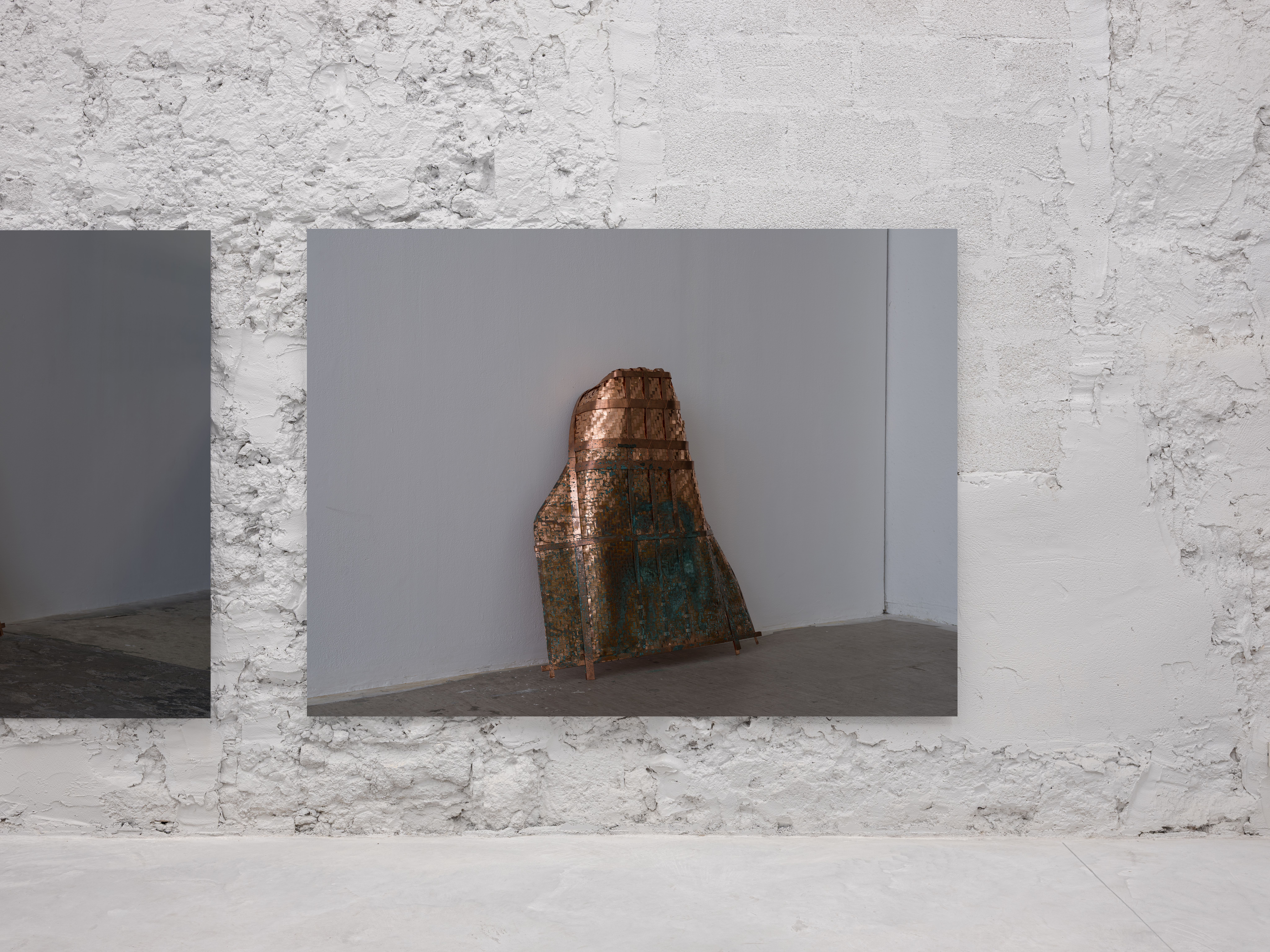 Per Untitled Sculpture I-II (entrambe 2025), Cho ha fotografato le sculture durante la loro installazione in una recente mostra a Francoforte, utilizzando una fotocamera di medio formato da 400 megapixel per catturare le opere in scala uno a uno. Esporre le immagini delle opere anziché le sculture stesse significa evocare la perdita inevitabile – sia di dettaglio sia di coinvolgimento – insita nelle riproduzioni delle opere d’arte, che di solito si rivedono circolando online o stampate nelle pubblicazioni. Inoltre, Cho introduce la dimensione della soggettività nella documentazione delle opere d’arte. Sebbene siano spesso fotografi professionisti a documentare l’arte, esiste una genealogia di artisti che hanno fotografato i propri lavori; esempi precoci sono Constantin Brancusi e Medardo Rosso, quest’ultimo unico fotografo delle proprie sculture.