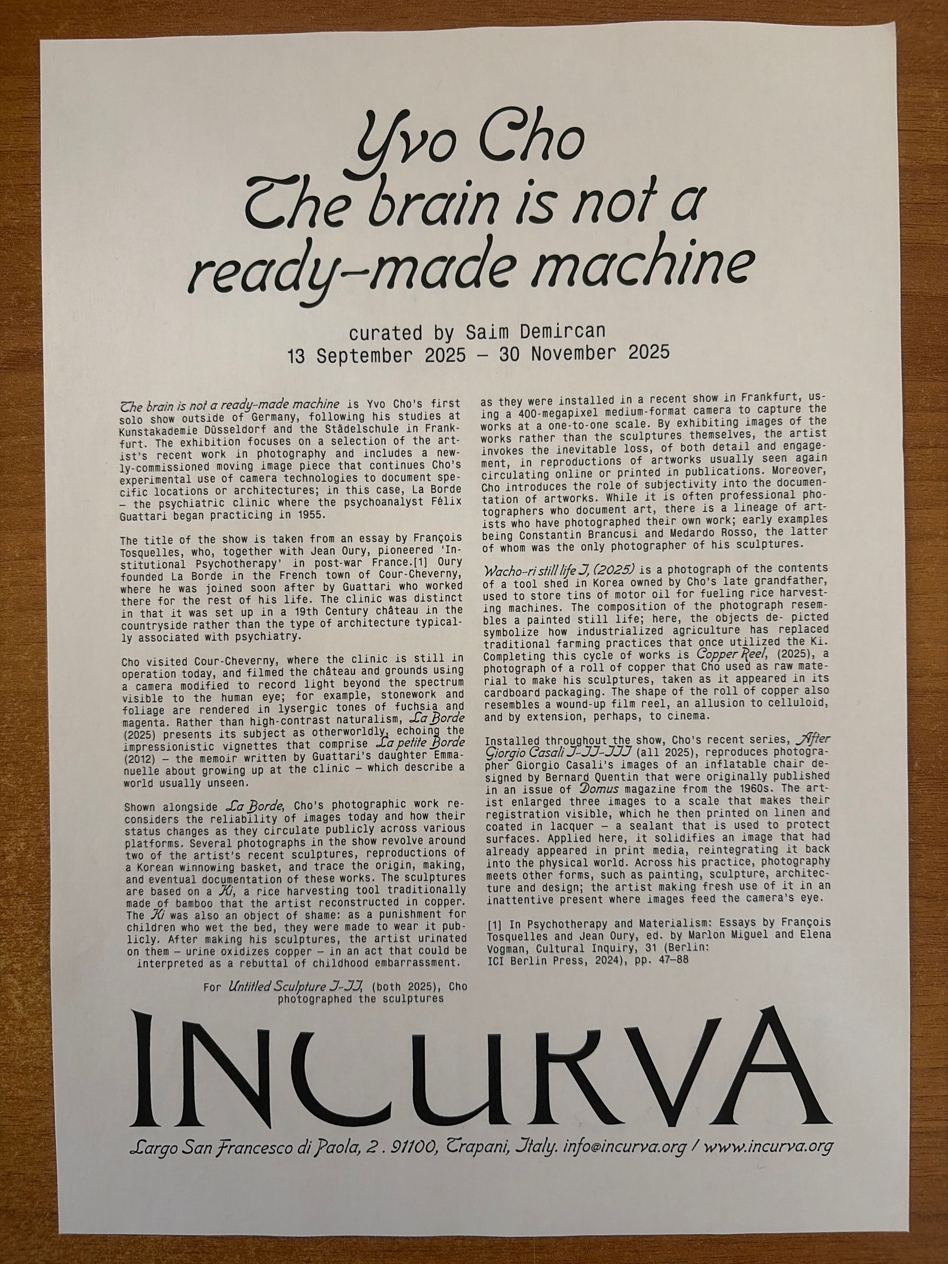 The brain is not a ready-made machine è la prima mostra personale di Yvo Cho fuori dalla Germania, dopo i suoi studi alla Kunstakademie di Düsseldorf e alla Städelschule di Francoforte. La mostra si concentra su una selezione di fotografie recenti e include un’opera video, appositamente commissionata, che prosegue l’uso sperimentale delle tecnologie della fotocamera da parte dell’artista per documentare luoghi o architetture; in questo caso, La Borde – la clinica psichiatrica in cui lo psicoanalista Félix Guattari iniziò a praticare nel 1955. Il titolo della mostra è tratto da un saggio di François Tosquelles che, insieme a Jean Oury, fu tra i pionieri della psicoterapia istituzionale nella Francia del dopoguerra. [1] Oury fondò La Borde nella cittadina francese di Cour-Cheverny, dove venne presto raggiunto da Guattari, che vi lavorò per il resto della sua vita. La clinica si distingueva per essere stata istituita in un castello ottocentesco in campagna, piuttosto che nel tipo di architettura solitamente associata alla psichiatria.